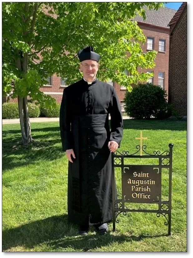 I am Fr. Christopher Anthony Pisut and I was born August 28, 1969 in Des Moines, Iowa, the feast of St. Augustin. I have an older brother, Anthony and a younger sister, Gina. My parents Emery and Raymonda are deceased. I attended St. Anthony’s parish and school on the South Side. I graduated from Dowling Catholic High School in 1987. I am also an Eagle Scout. I graduated from Iowa State University in 1992 with a B.S. in History and a minor in religion. I graduated from the Catholic University of American (CUA) in Washington D.C. in 1998 with an M.A. in Church History. I studied for the priesthood at St. Mary of the Lake Mundelein Seminary where I received my M. Div. and an S.T.B. and was ordained in 2003. I served as parochial vicar at St. Francis of Assisi parish in West Des Moines from 2003-2006. I graduated from CUA in 2008 with my J.C.L. in Canon Law. I was pastor of Sacred Heart, Chariton; St. Brendan, Leon; and St. Francis, Leon from 2008-2015. I have been pastor of St. Augustin parish since 2015 and Judicial vicar of the Diocese of Des Moines since 2009. I also have served the Traditional Latin Mass community since 2022.